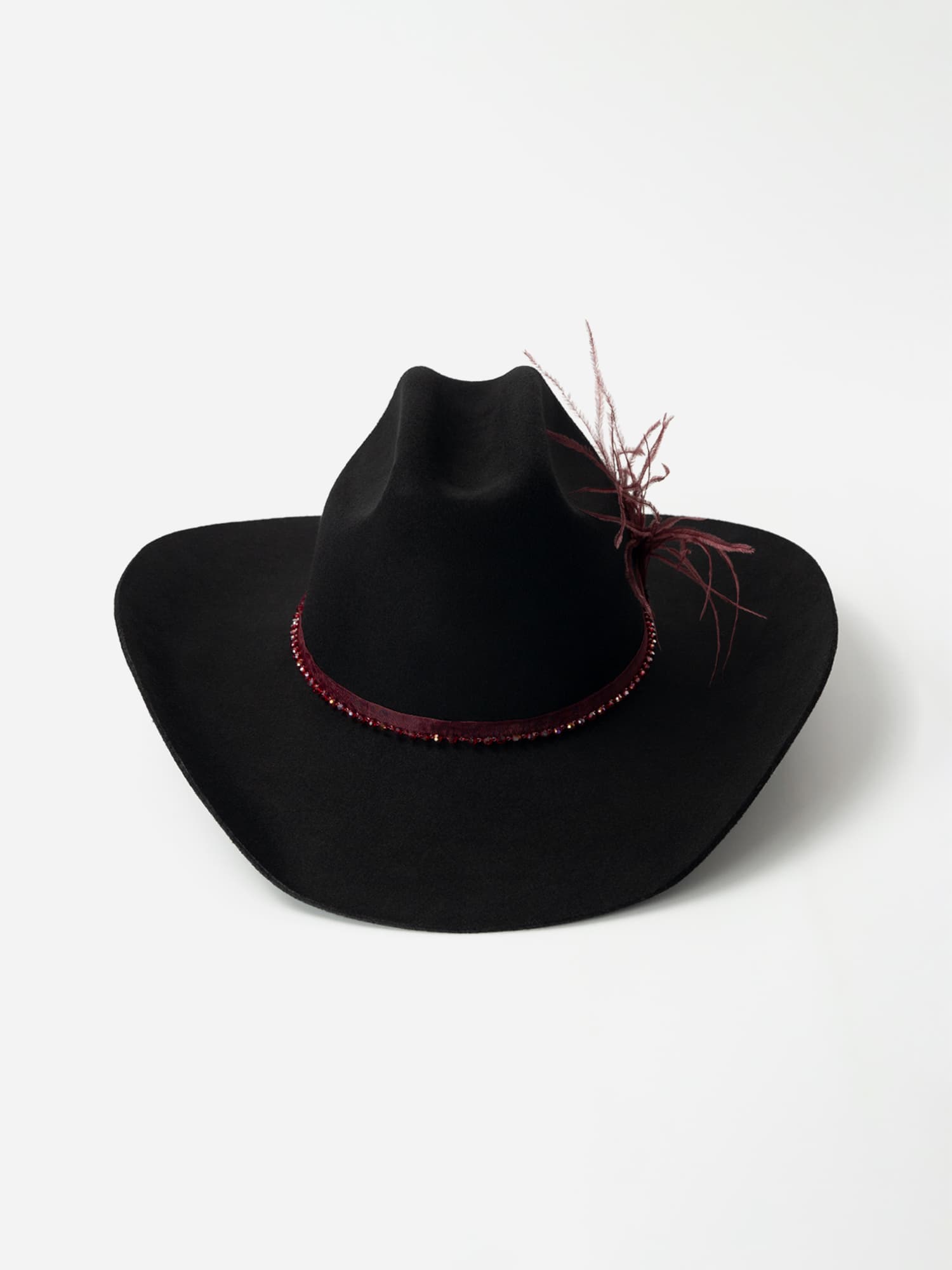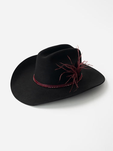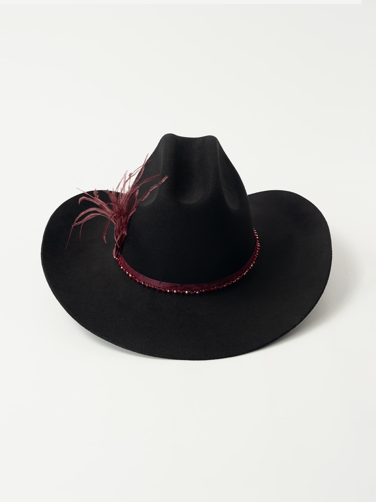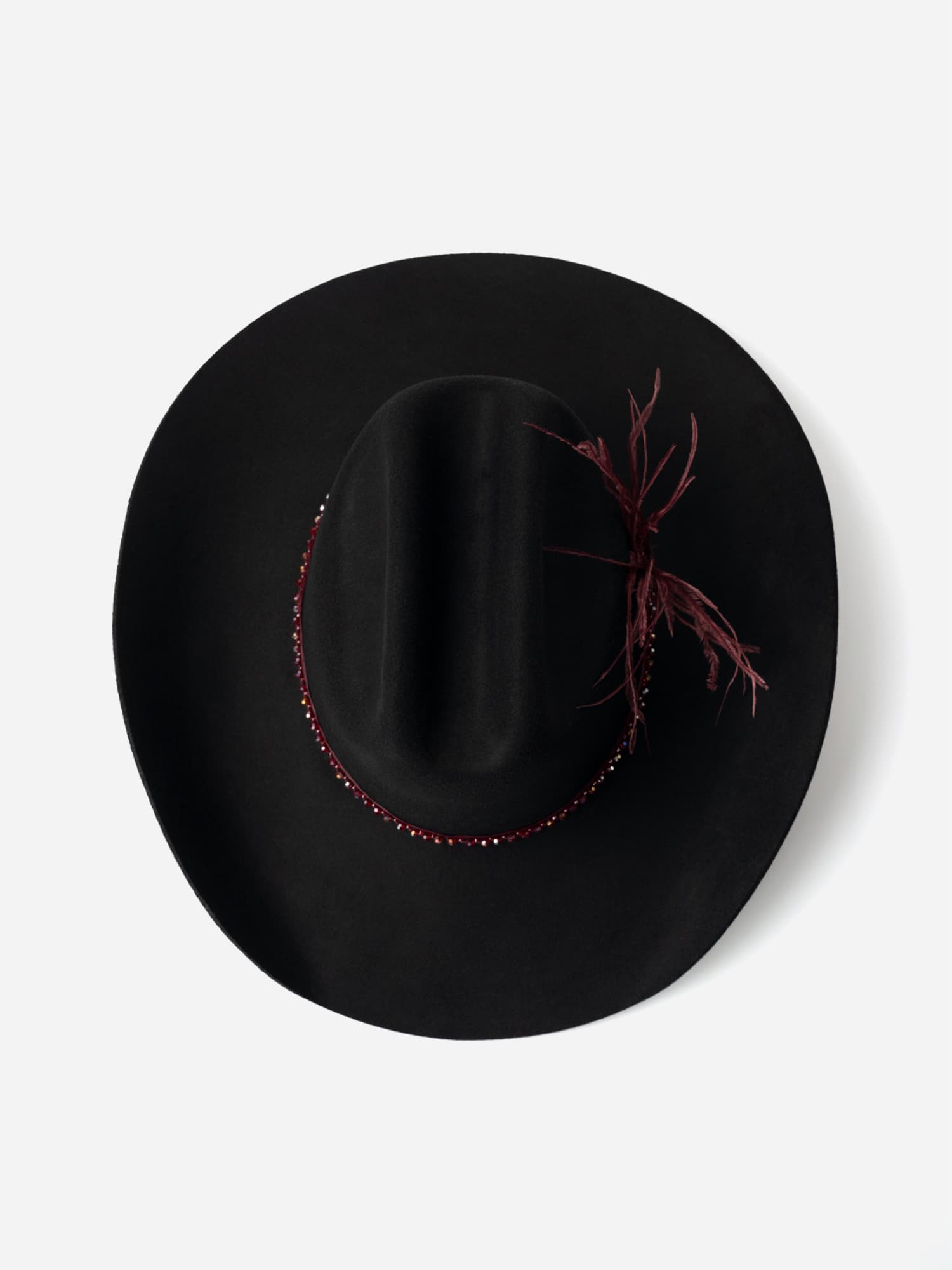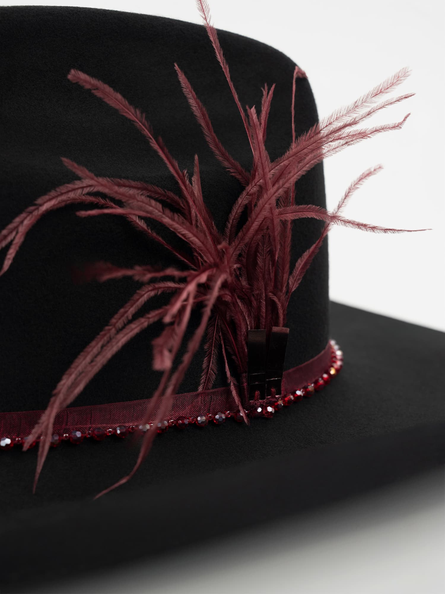 The crown is finished with a deep burgundy ribbon hatband adorned with fine beadwork along the base, and an asymmetric spray of red feathers that rise lightly from one side — a statement piece that fuses movement, elegance, and edge.