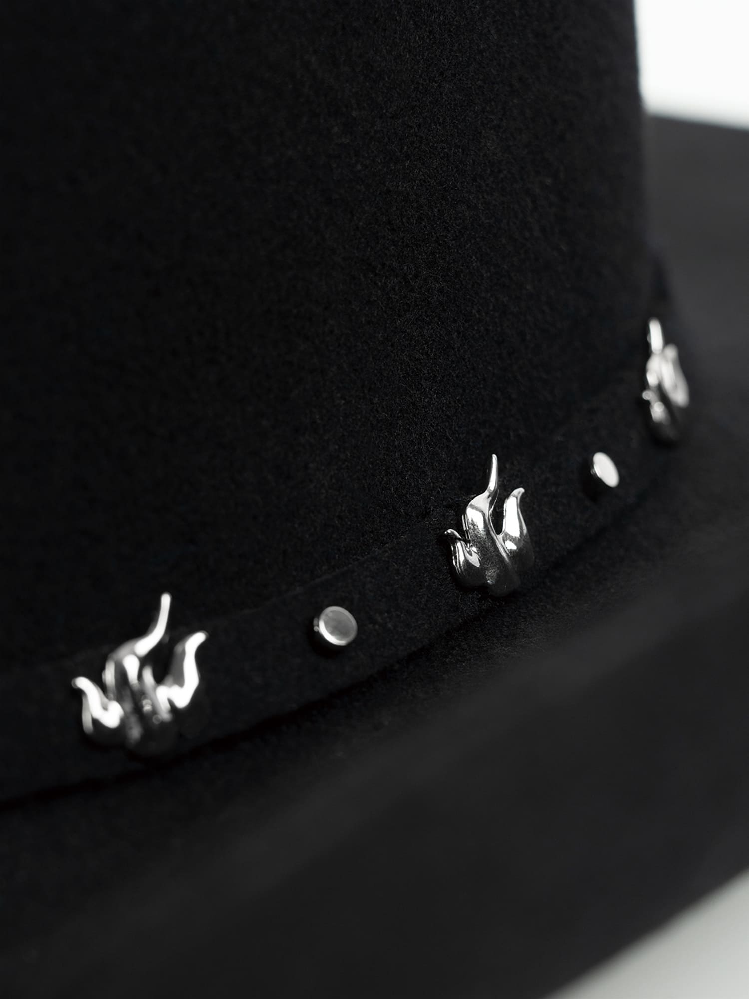 The crown is finished with a felt band studded with flame-shaped metal accents — a bold contrast of heat and restraint that ignites any look with fearless style.