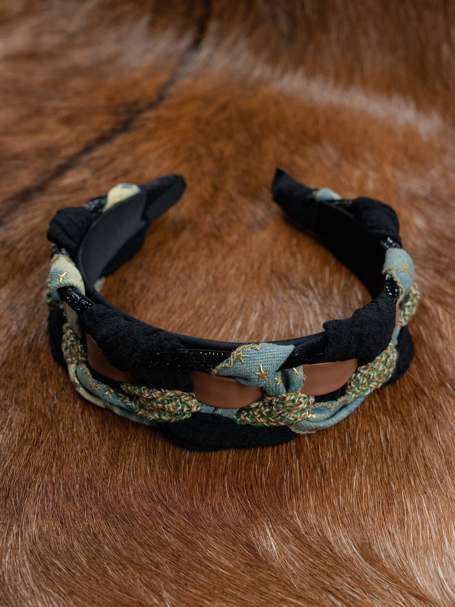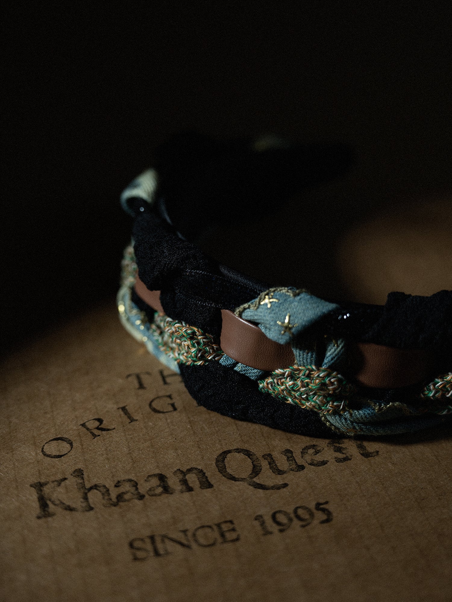 Woven from leather and textured fabric with metallic threads, it creates layered dimension and refined balance. Designed to complement any hat style, it offers versatility through craftsmanship — a quiet statement that redefines modern hat styling.