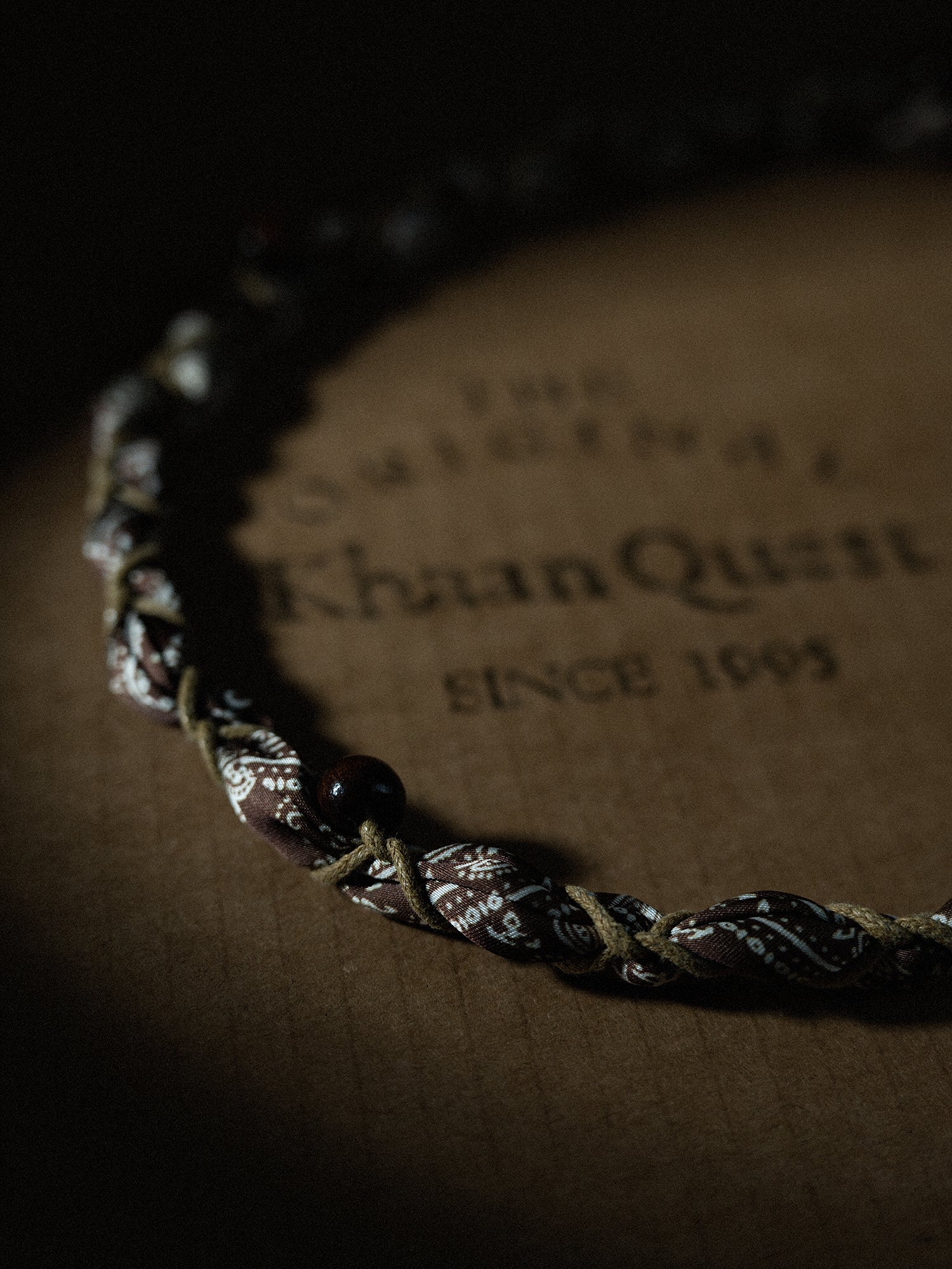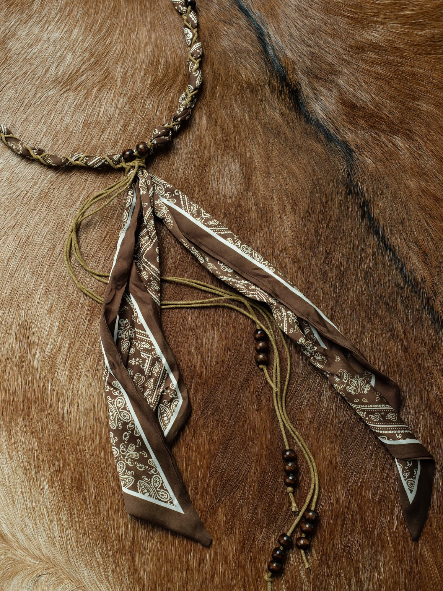 Made from interwoven silk ribbons in brown and khaki tones, it’s finished with wooden bead details that add warmth and rhythm. Designed to complement any hat style, it moves naturally and drapes with quiet confidence — an accent of effortless individuality.