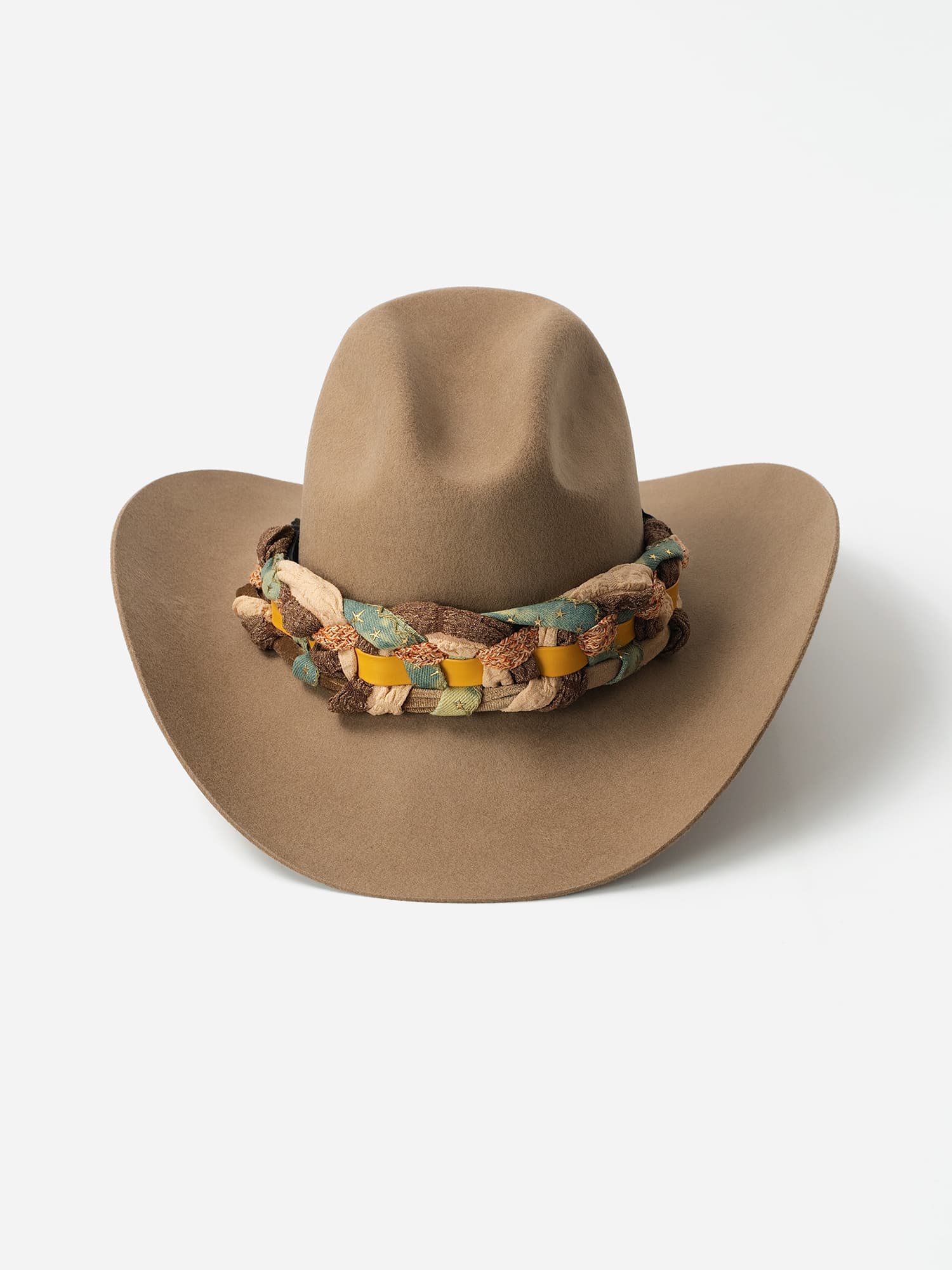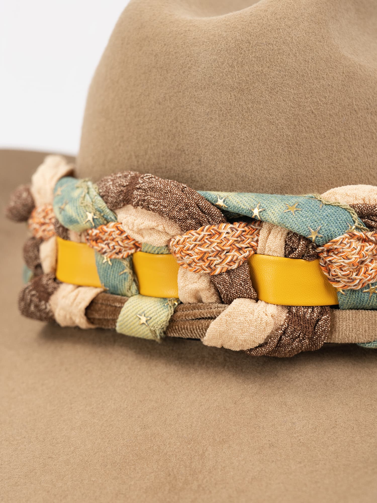The crown is finished with a multi-textured braided hatband combining woven fabric, soft threads, and smooth yellow leather — accented with subtle golden stars that lend a hint of wanderlust sparkle.