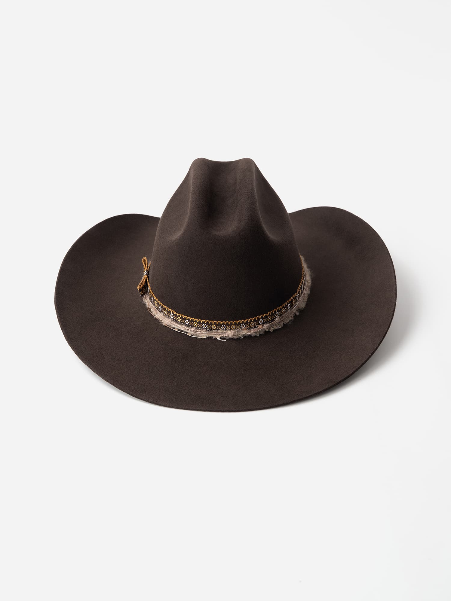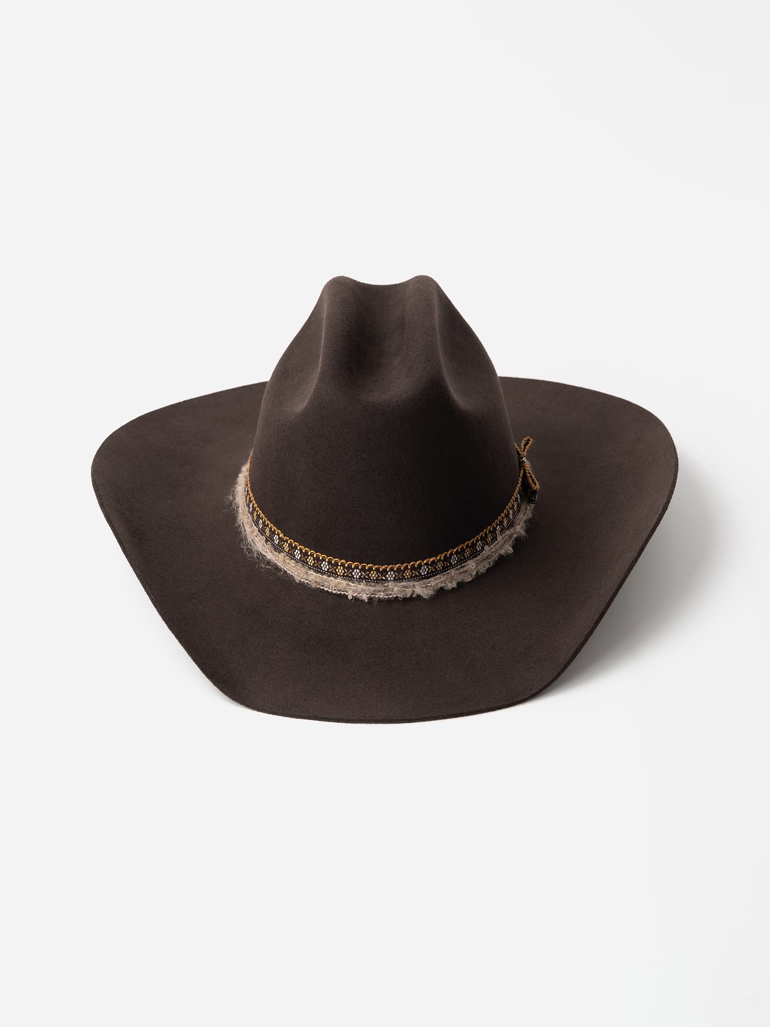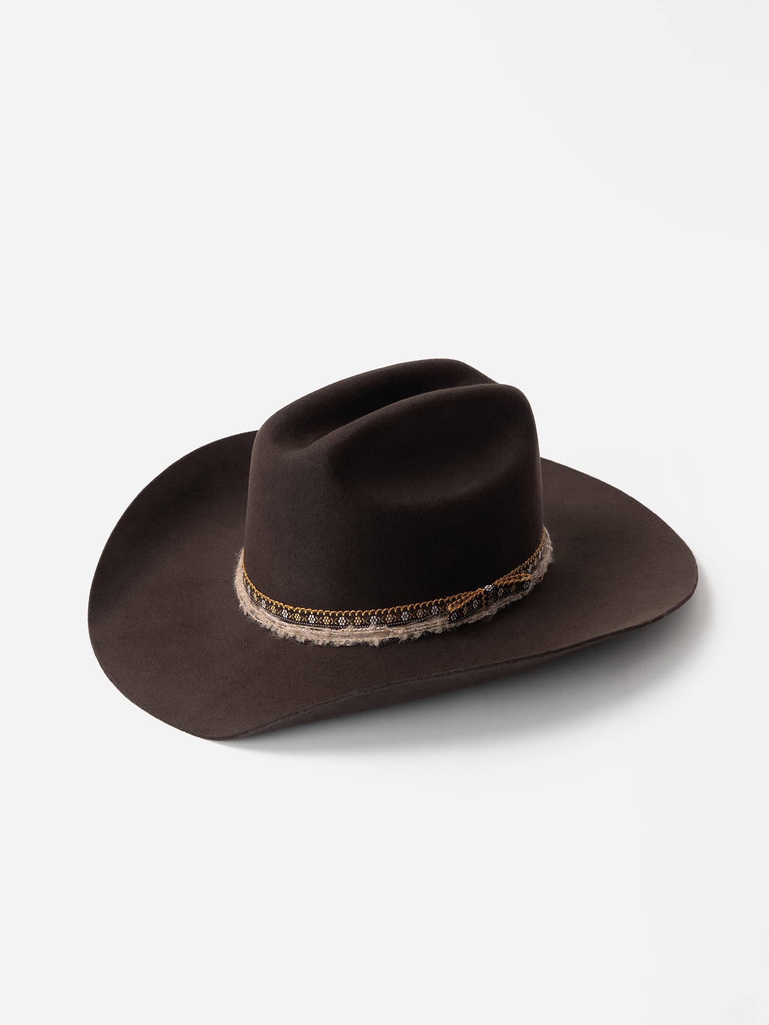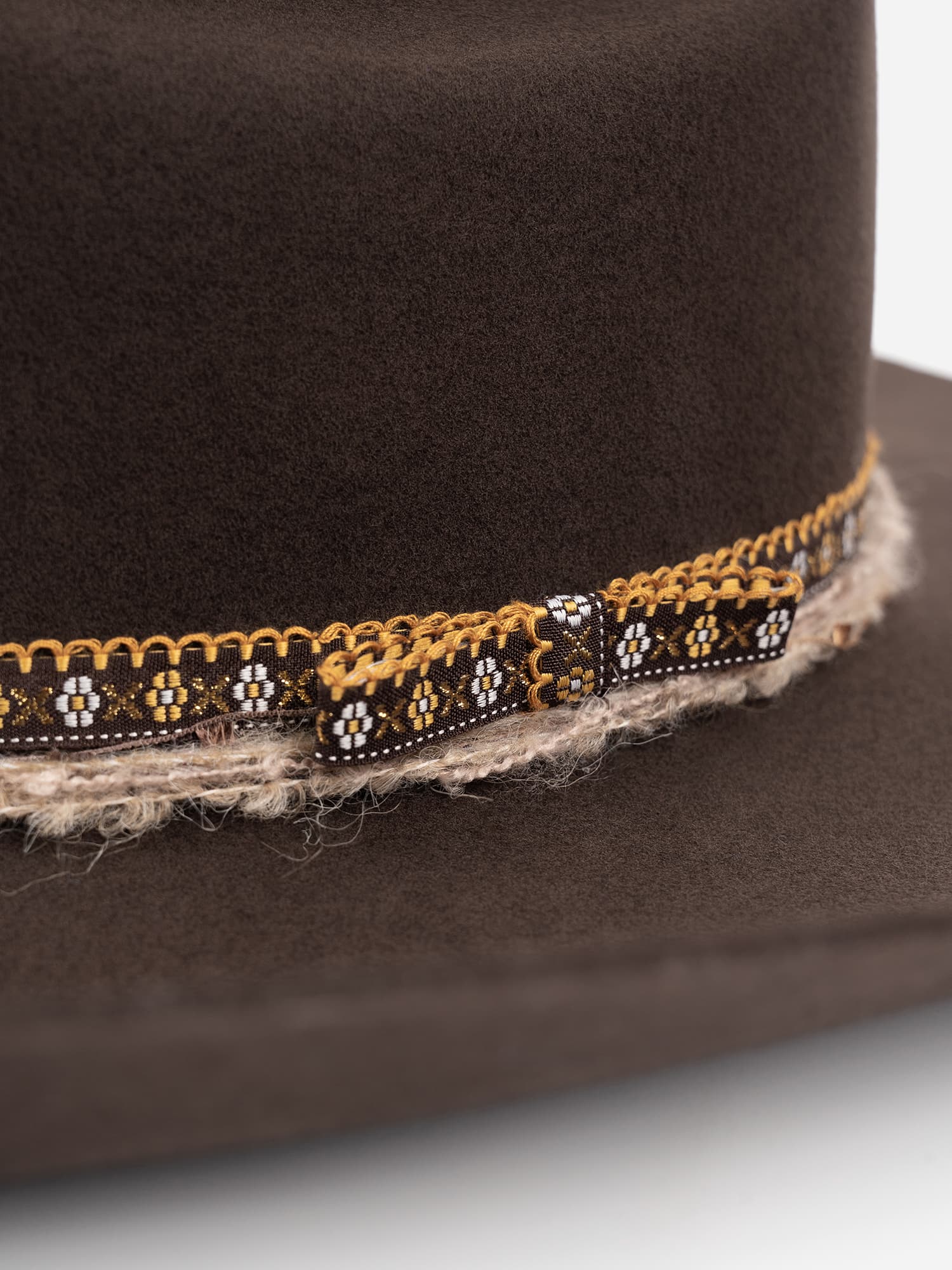 The crown is finished with a rustic woven hatband adorned with petite floral motifs, soft frayed fibers, and golden embroidered edges — a tactile balance of folk craftsmanship and refined Western elegance.