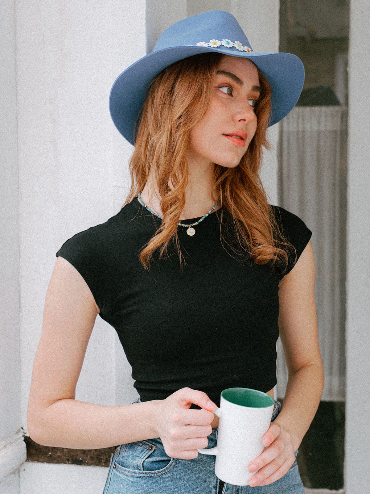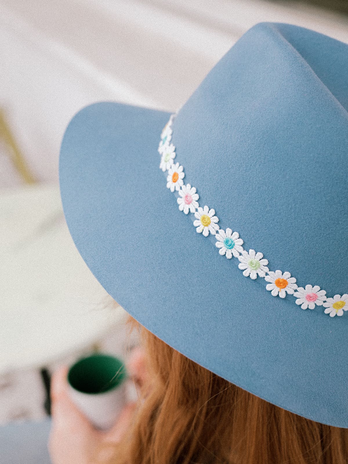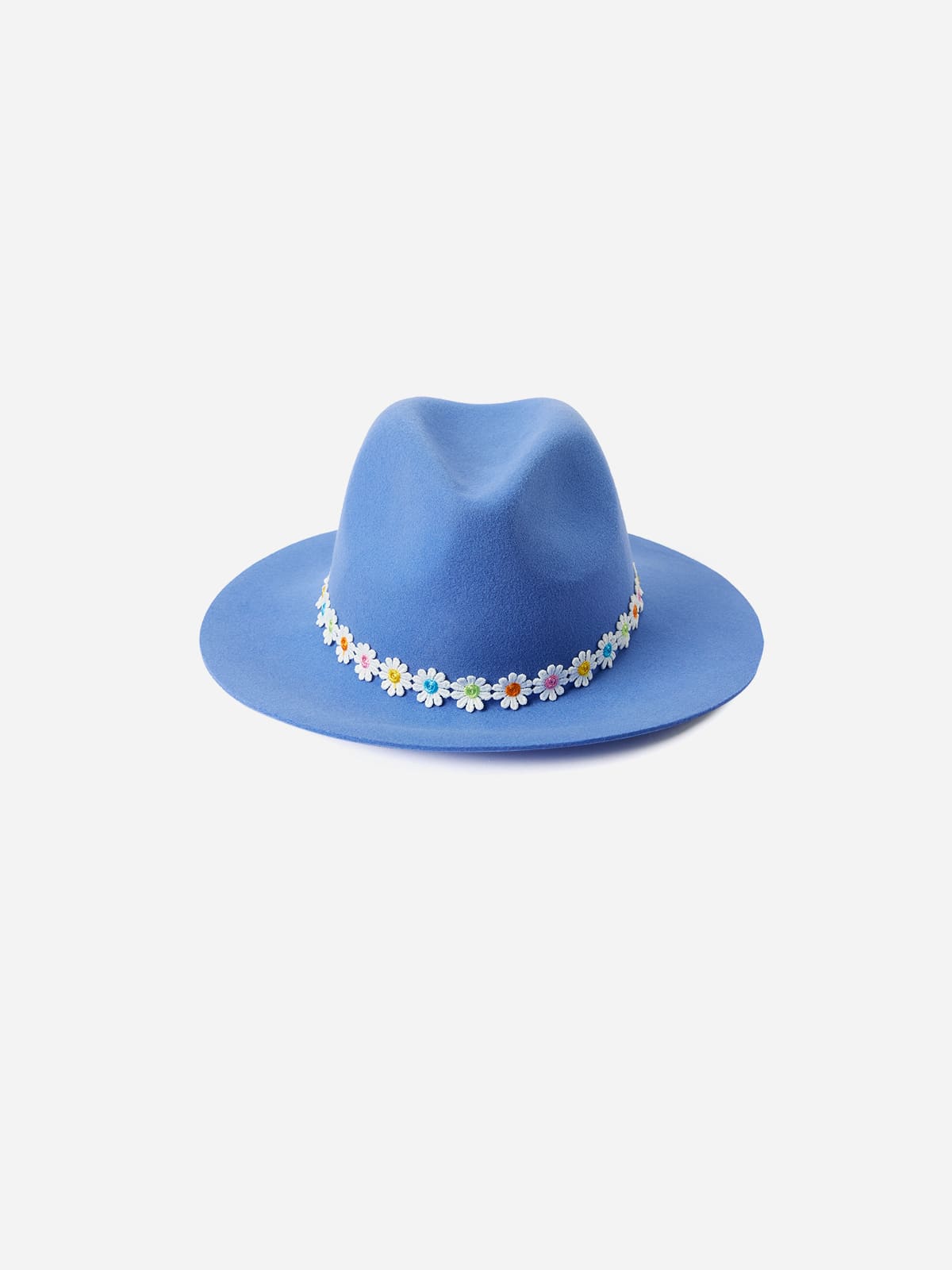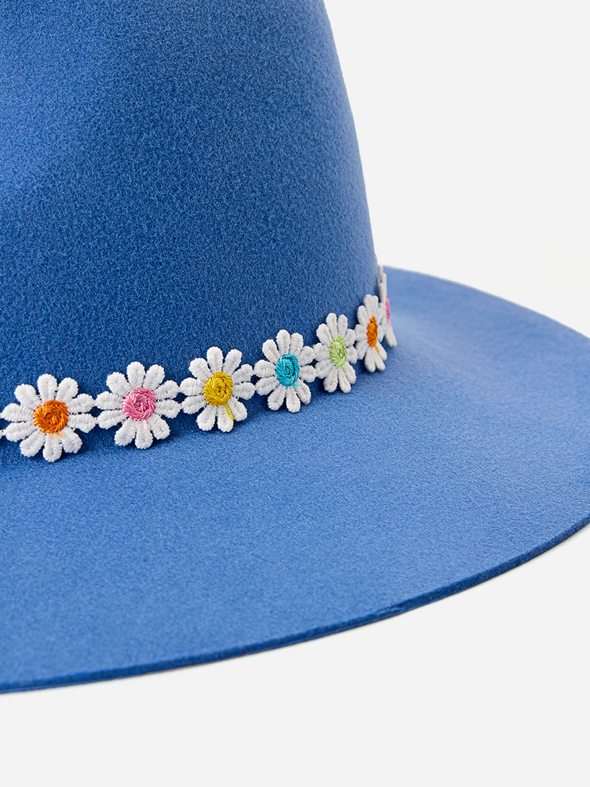 The Urban Muse Felted Wool Hat celebrates color and creativity — where Parisian charm meets downtown ease. Crafted in a clean sky-blue felt, the hat is finished with a hand-embroidered daisy trim in playful rainbow hues. Designed for the dreamers, the doers, the modern muses.