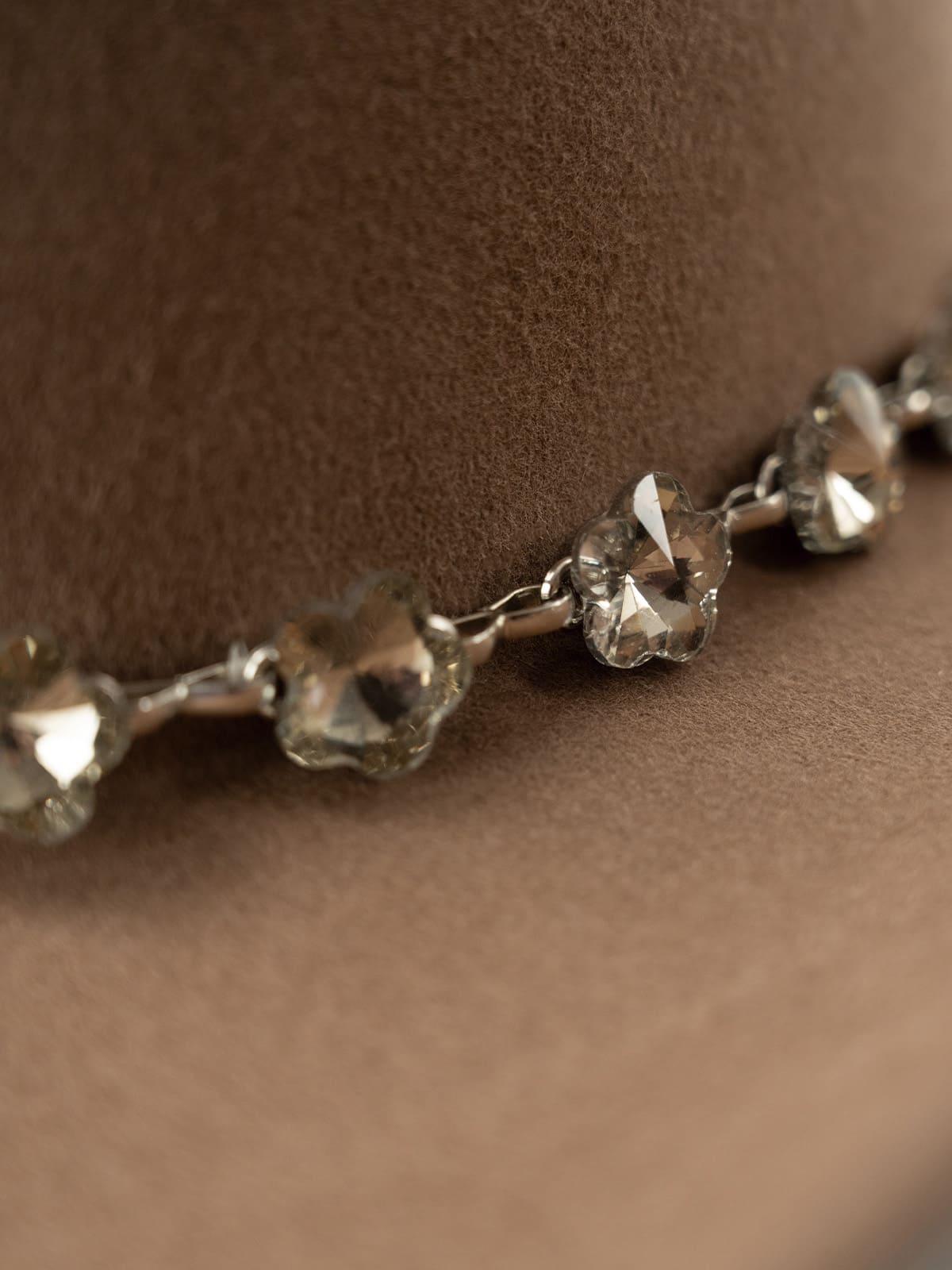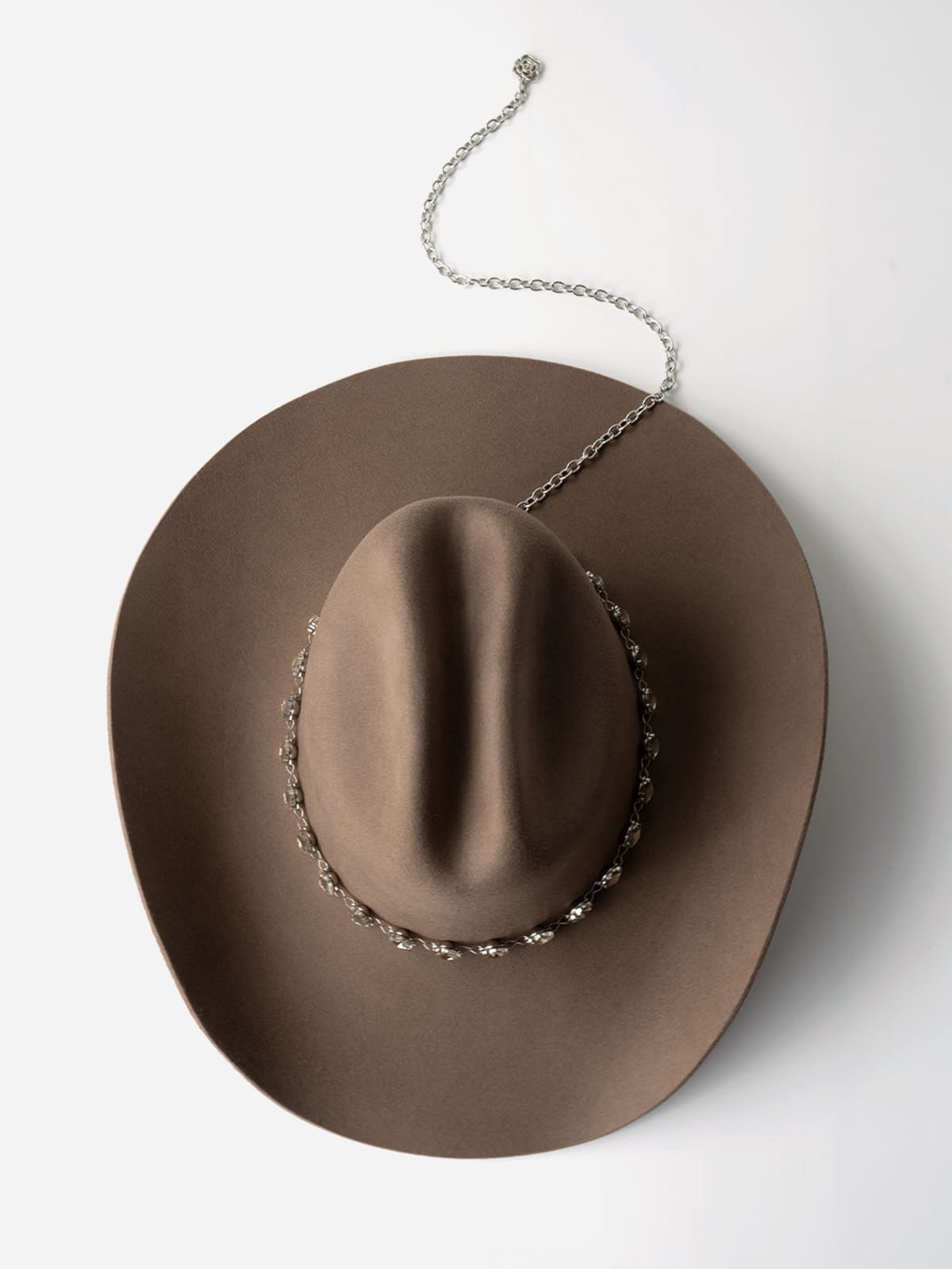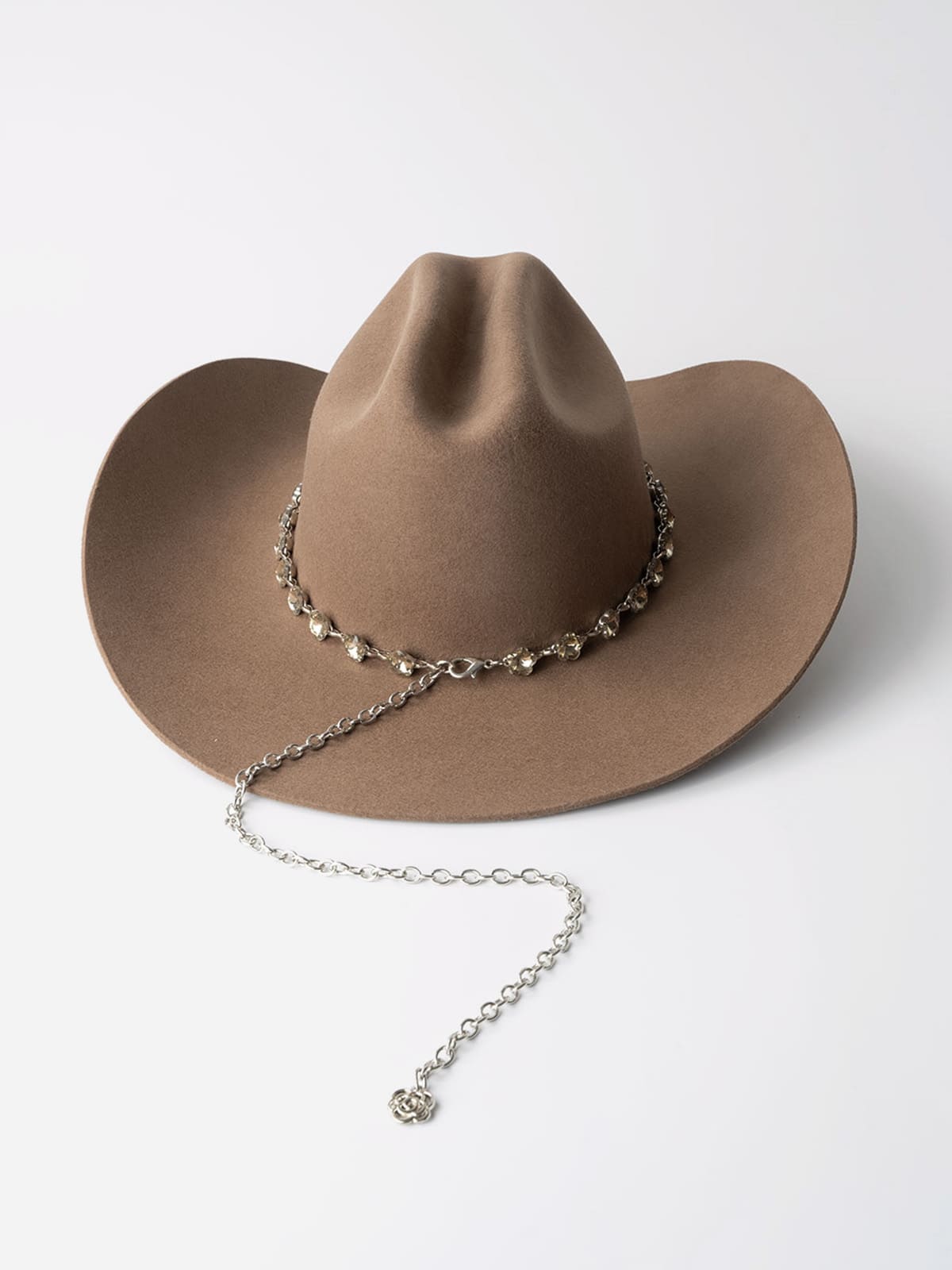 The Urban Nomad Felted Wool Hat blends western heritage with a modern edge. Crafted from brown felt, it’s adorned with faceted metallic florals that shimmer subtly along the crown. A silver chain drapes gracefully around the brim, finished with a rose charm.