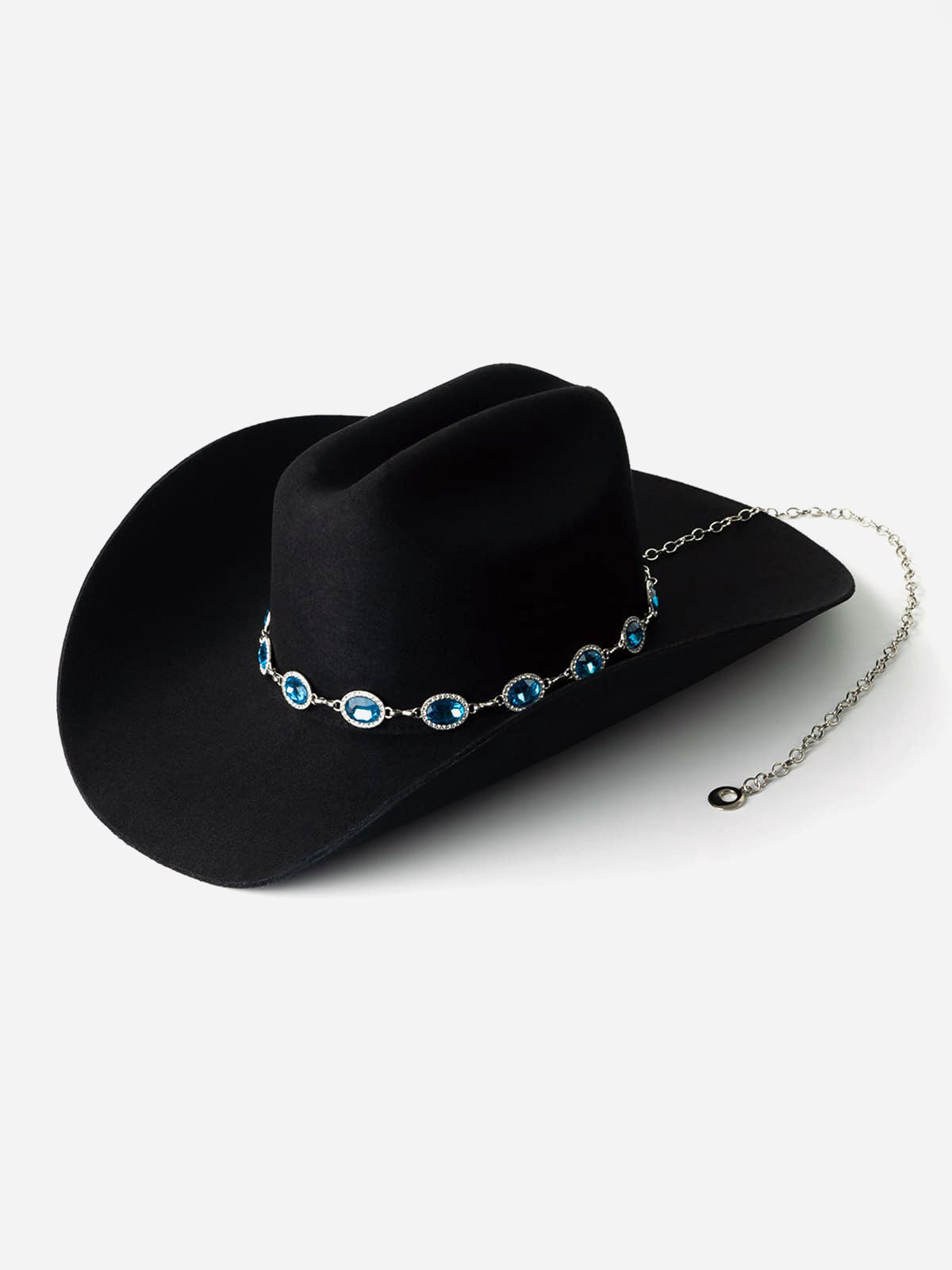 The Urban Trail Felted Wool Hat in black captures a modern Western attitude with a sleek urban edge, featuring a bold turquoise-toned gemstone chain that wraps around the crown — detachable for effortless styling.