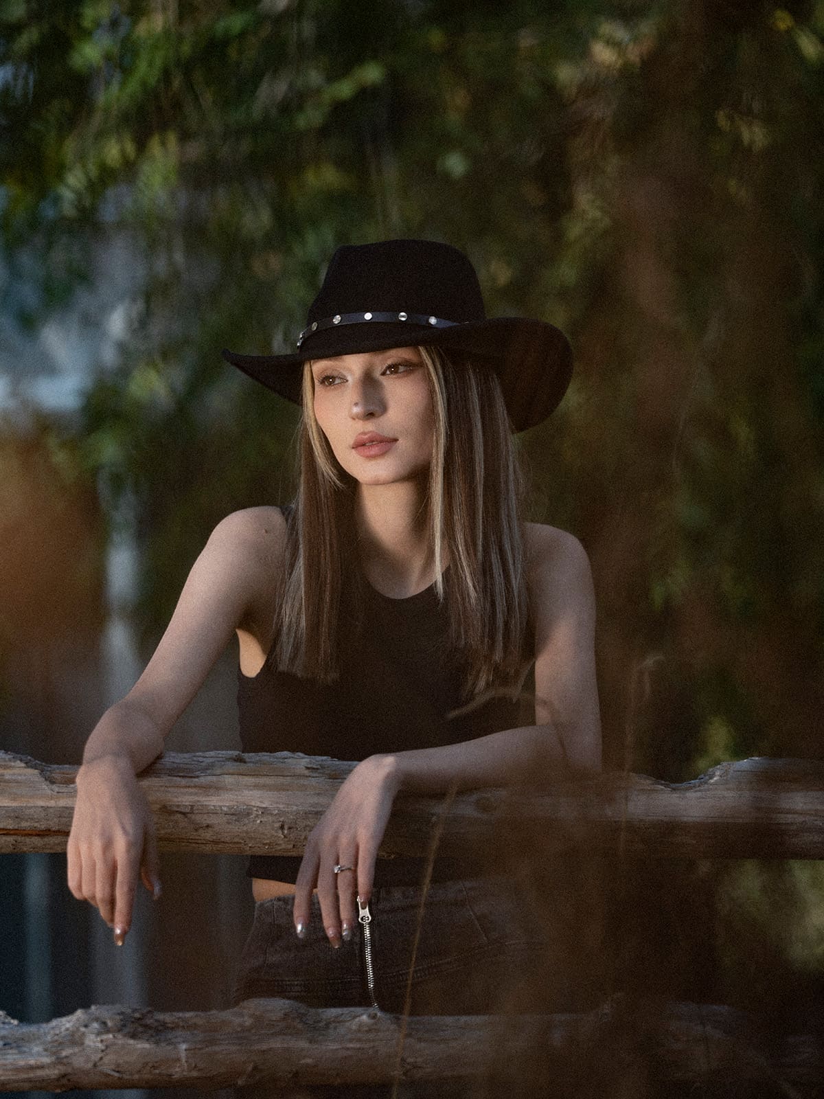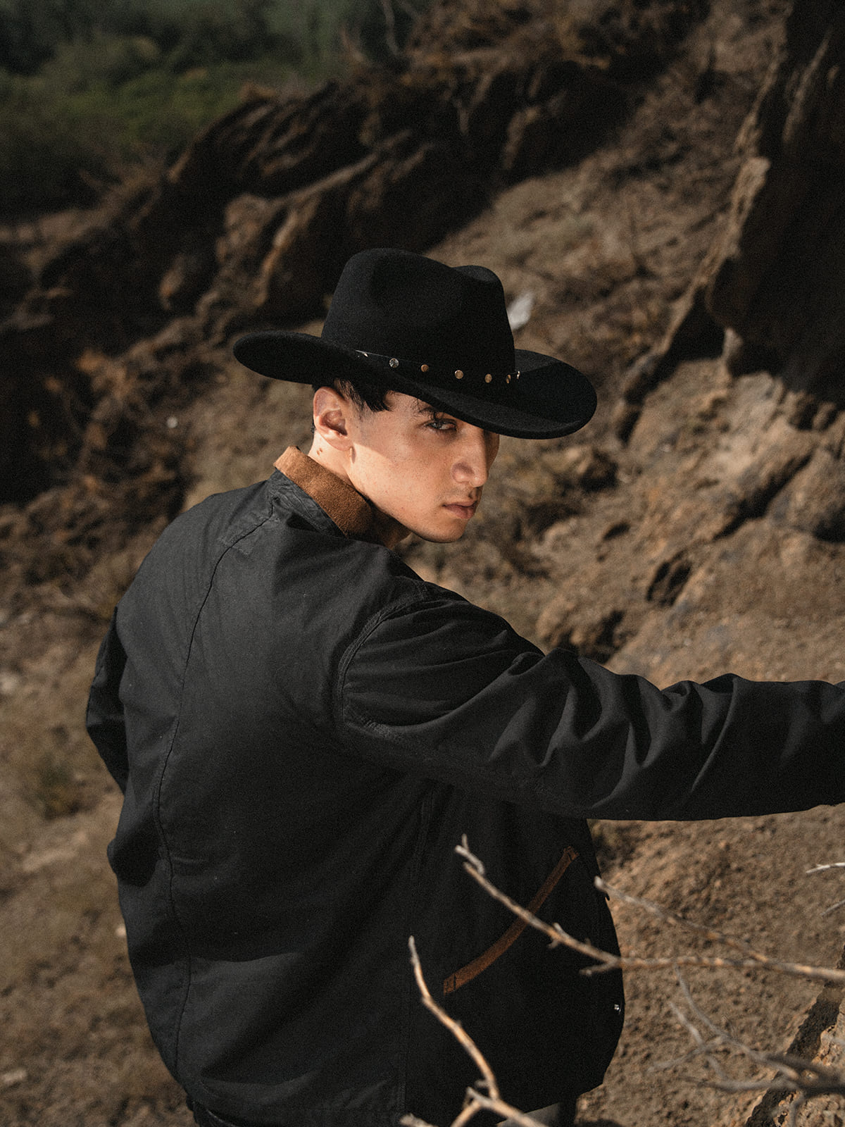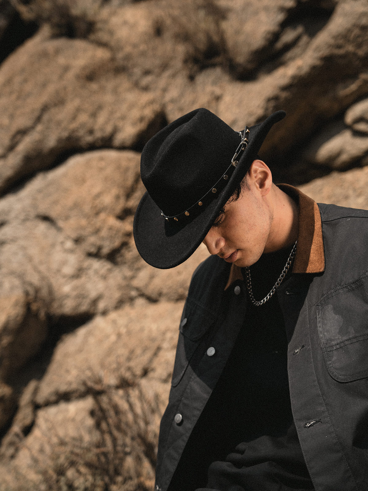 The Steel Spur Wool Felt Western Hat brings bold edge to classic western style. Designed to hold its shape, resist light water, and deliver lasting comfort, it’s finished in black with a studded band. This western fedora hat adds rugged character that transitions seamlessly from outdoor trails to city nights, reflecting the timeless tradition of felt western hats.