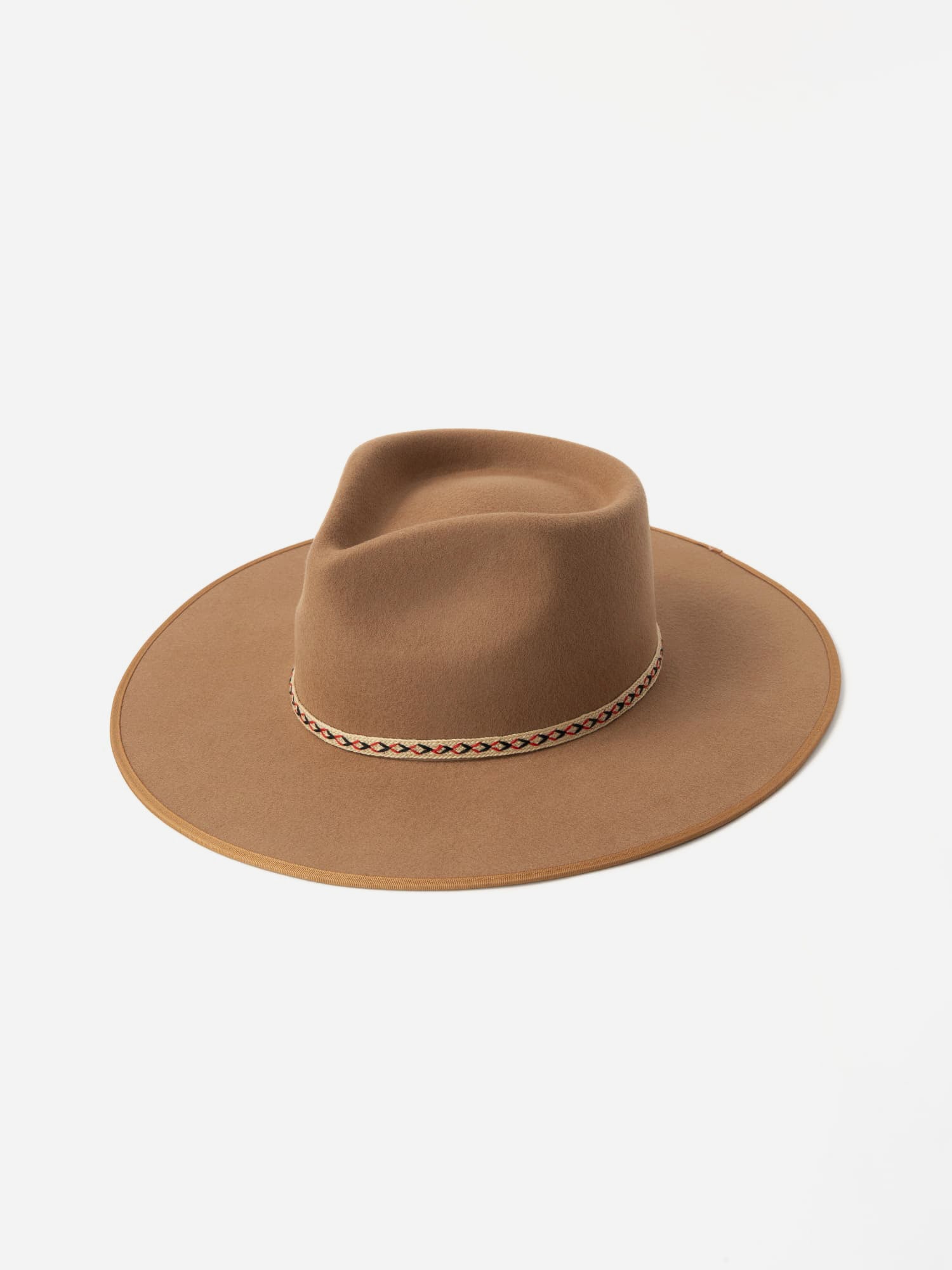 Around the crown, a woven cream band threaded with red and black accents adds a handcrafted touch — a subtle nod to free-spirited artistry and timeless design.