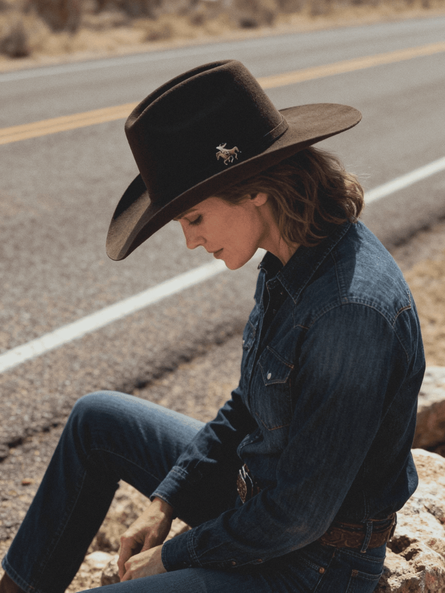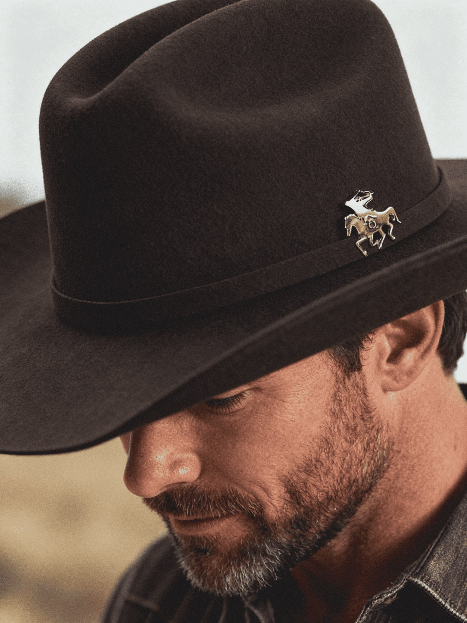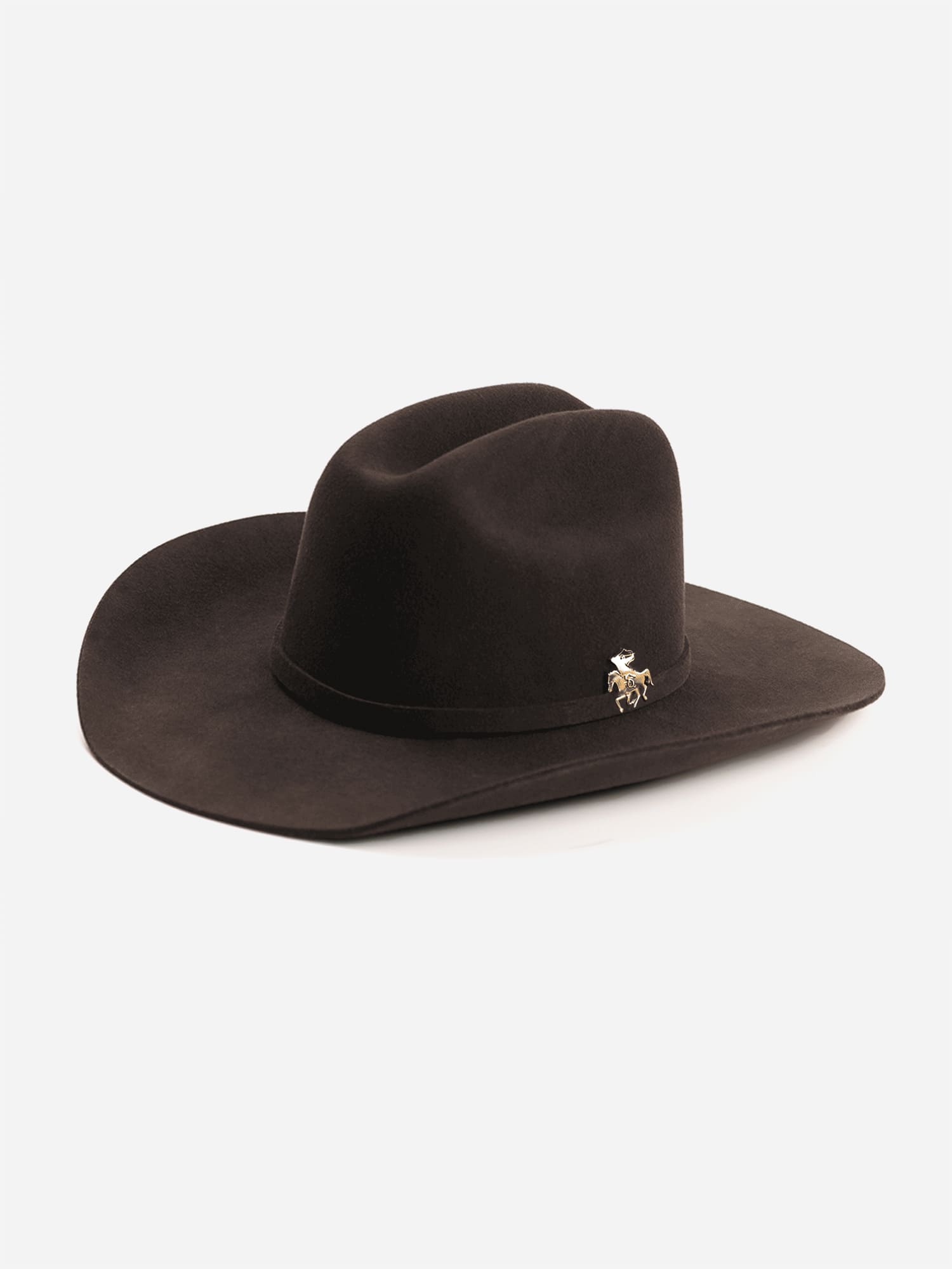 A gold-tone rider emblem punctuates the hatband, adding a precise, intentional detail without breaking the simplicity of the form. Built from dense wool felt with restrained finishing, it’s a design that speaks through clarity.