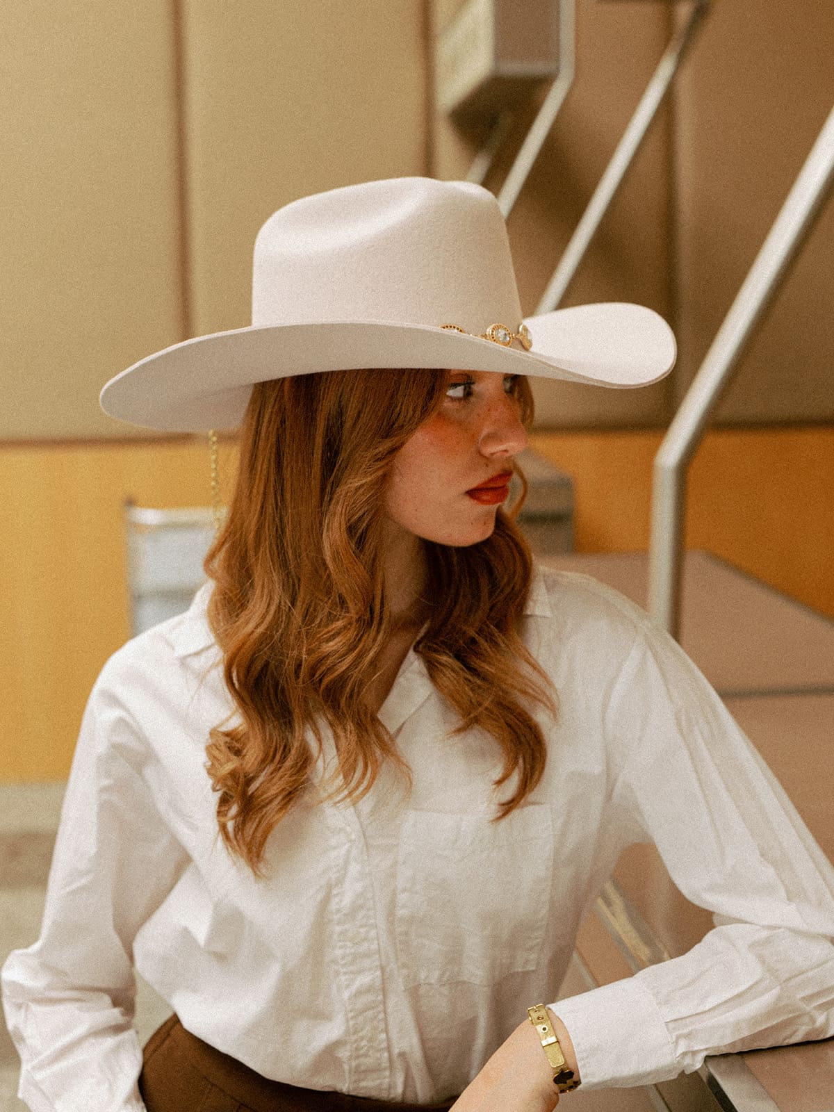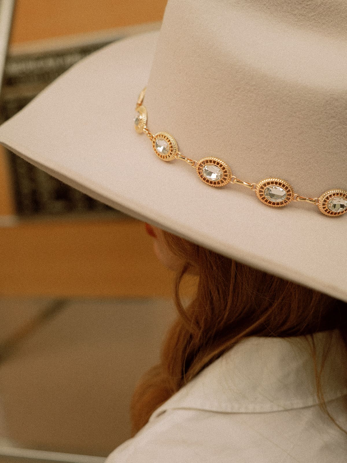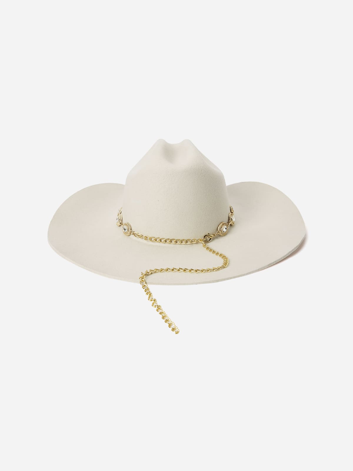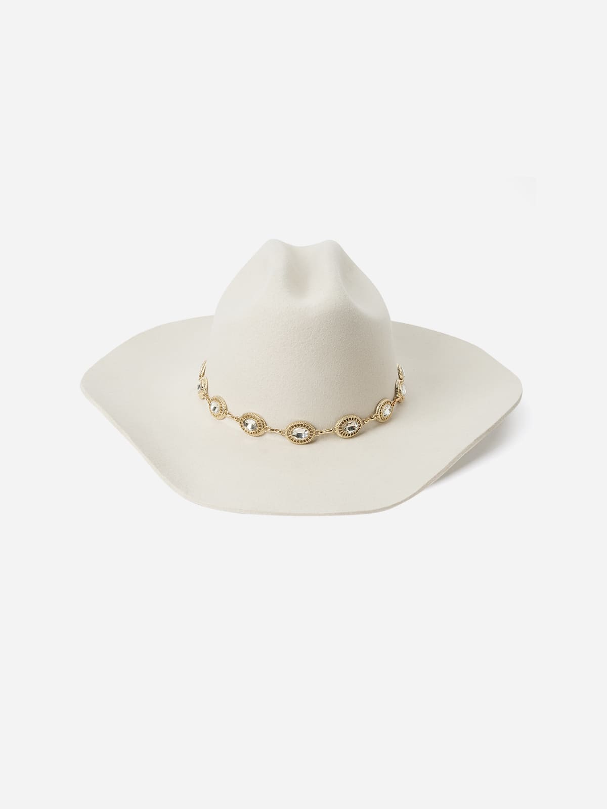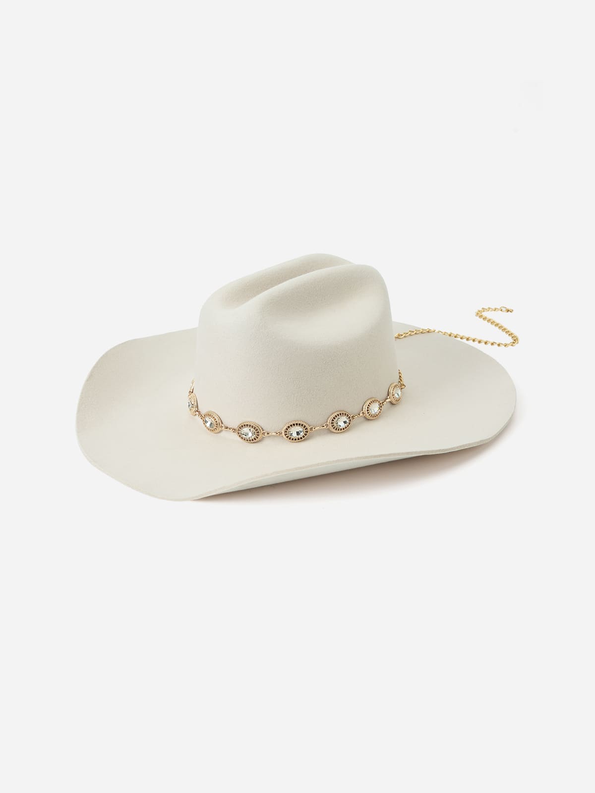 The Urban Trail Felted Wool Hat brings modern refinement to a western classic. Crafted in ivory felt, the hat is finished with a gold-trimmed chain of oval crystal accents that catch the light with every step. The clean silhouette meets quiet opulence — understated, elegant, and undeniably bold.